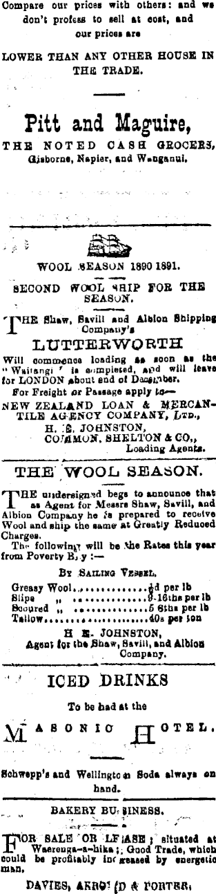 Compare our prices with others: and w« don’t profess to sell at cost, and our prices are LOWER THAN ANY OTHER HOUSE IN THE TRADE. Pitt and Maguire, THE NOTED CASH GROCERS, Gisborne, Napier, and Wanganui, WOOL SEASON 1890 1891. SECOND WOOL SHIP FOR THE SEASON. 'PHE Shaw, Savill and Albion Shipping I Company’s LUTTERWORTH Will commence loading a» soon as the " Waitangi ’ ia oumpleted. *£>d will leave for LONDON about end ot Dawibcr. For Freight ot Pa.aage apply th— NEW ZEALAND LOAN & MERCANTILE AGENCY COMPANY, Ltd., H. :a. JOHNSTON, COMMON. SHELTON & GO,, Loading Agents. THE WOOL SEASON. THE undersigned begs to announce that as Agent for Meaars Shaw, Savill, and Albion Cumpaxiy he fs prepared to receive Wool and ship the same' at Greatly Reduced Charges. Th.- following will be the Rates thia year from Poverty B, y :— By Sailing VzsexL. Greasy Wool Ad per lb Blips 9-lGths perib Scouted ~ 5 6th. per lb Ta110w........40s per ton H R- JOHNSTON, Agent tor tbe Nbaw, Savill, and Albion Company. ICED DRINKS To be had at tho ABO N I O pp OTE L . Schwepp’s and Wellingto m Soda always en hand. BAKEBY BU< SINESS. J7IOR BALE OB LFIABE j situated at Jj Waereuga-a-hika ;. Good Trade, which could bo profitably inr nreased by energetic man, DAVIES, AKR»’ (p * PORTER;