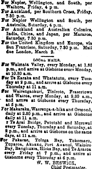 For Napier, Wellington, and South, per Waihora, Friday, 4 pm. For Auckland, per Southern Croce, Friday, 7.30 p.m. For Napier Wellington and South, per Australia, Saturday, 4 p.m. For Auckland and Australian Colonics, India, China, and Japan, per Mararoa, Saturday, 7 30 p.m. For the United Kingdom and Europe, via San Francisco, Saturday, 730 p.m. Mail due London, March 2. LOCAL HAILS. For Waimata Valley, every Monday, at 1.30 p.m., and arrive at Gisborne everv Monday, at 10.30 a.m. For To Karaka and Whatatutu, every Tuesday at 2 p.m., and arrive at Gisborne every Thursday at 11 a.m. For Wairengaokuri, Tiniroto, Frasertown and Wairoa, every Monday, at 9.30 a.m., and arrive at Gisborne every Thursday, at 5 p.m. For Makaraka, Waerenga-a-hika and Ormond, daily at 2.80 p.m., and arrive at Gisborne daily at 11 a.m. r Te Arai Bridge, Patatahi and Murewai every Tuesday, Thursday and Saturday, at S p.m., and arrive at Gisborne on the same days, at 11 a.m. For Pakarae, Tologa Bay, Tokomaru, Tuparoa, Akuaxu, Port Awanui, Waipiro Bay, BangituKia, Hicks Bay, and Te Araroa every Friday at 7 p.m., and arrive at Gisborne every Thursday at 6 p.m. W. W. BESWICE, Chief Postmaster.