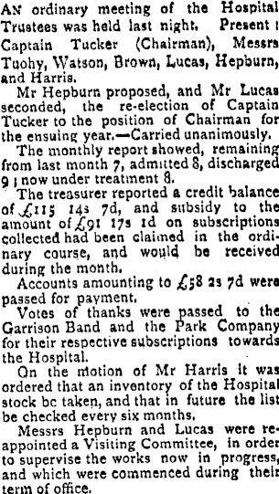 AN ordinary meeting of the Hospital Trustees was held last night, Present I Captain Tucker (Chairman), Messrs Tuohy, Watson, Brown, Lucas, Hepburn, and Harris. Mr Hepburn proposed, and Mr Lucas seconded, the re-election of Captain Tucker to the position of Chairman for the ensuing year.—Carried unanimously. The monthly report showed, remaining from last month 7, admitted 8, discharged 9 ; now under treatment 8. The treasurer reported a credit balance oGZ I! S ! 4 3 7 d > and subsidy to the amount ofl7s td on subscriptions collected had been claimed in the ordinary course, and wopld be received during the month. Accounts amounting to /;8 is yd were passed for payment. Votes of thanks were passed to the Garrison Band and the Park Company for their respective subscriptions towards the Hospital. On the motion of Mr Harris it was ordered that an inventory of the Hospital stock be taken, and that in future the list be checked every six months. Messrs Hepburn and Lucas were reappointed a Visiting Committee, in order to supervise the works now in progress, and which were commenced during their term of office.