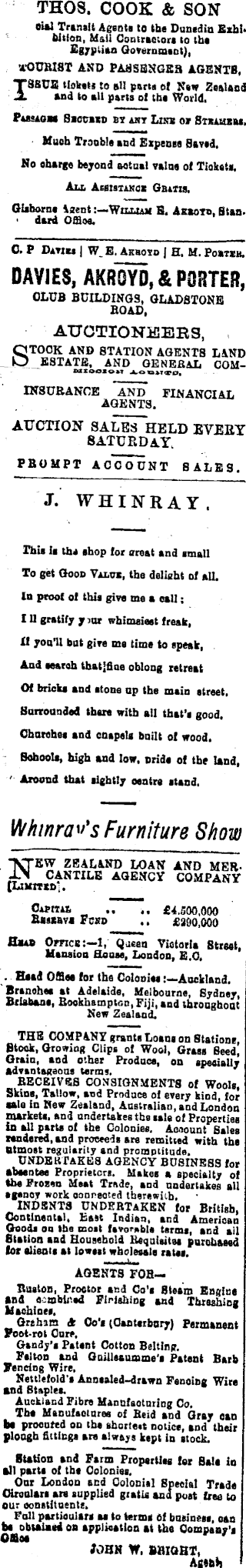 THOS. COOK & SON cial Transit Agents to the Dunedin Exhibition, Mail Contractors to the Egyptian Government), ’A’OURIST AND PABSENGE3 AGENTS, ZSSU2 tickets to all parts of New Zealand and to all parts of the World, Passages Siccaxo ns any Lise or Steamers, Much Trouble and Expense Saved, No charge beyond actual value of Tickets. All Assistance Gbitis. Gisborne kaentWilliam E. Akboyd, Stan, dard Office. C. P Davies | W. E. Akboyd | H. M. Pobtsu. DAVIES, AKROYD, & PORTED, CLUB BUILDINGS, GLADSTONE BOAD, AUCTIONEERS, STOCK AND STATION AGENTS LAND ESTATE, AND GENERAL COMUXOOIOM AOX3ATTO, INSURANCE AND FINANCIAL AGENTS. AUCTION SALES HELD EVERT SATURDAY. PBOMPT ACCOUNT SALES. J. WHINRAY. This is ths ehop for Great and small To get Good Value, the delight of all. In proof of this give me a call; 111 gratify y iur whimsiest freak, It you’ll but give me time to speak, And search tbatjfine oblong retreat Of bricks and stone up the main street. Surrounded there with all that’s good. Churches and cnapels built of wood. Schools, high and low, pride of the land, Around that lightly centre stand. Whinrav's Furniture Bhow NEW ZEALAND LOAN AND MERCANTILE AGENCY COMPANY [Limited'. Capital .. .. £4.500,000 Bxsebvx Fund .. £290,000 Head Ornes:—l, Queen Victoria Street, Mansion House, London, E.O, Head Office for the Colonies Auckland. Branches at Adelaide, Melbourne, Sydney, Brisbane, Rockhampton, Fiji, and throughout New Zealand, THE COMPANY grants Loans on Stations Stock, Growing Clips of Wool, Grass Seed, Grain, and other Produce, on specially Advantageous terms. ' RECEIVES CONSIGNMENTS of Wools, Skins, Tallow, and Produce of every kind, for sale in New Zealand, Australian, and London markets, and undertakes the sale of Properties in all parts of the Colonies. Account Sales rendered, and proceeds are remitted with the Utmost regularity and promptitude. UNDERTAKES AGENCY BUSINESS for absentee Proprietors. Makes a specialty of the Frozen Meat Trade, and undertakes all sgenev work connected therewith, INDENTS UNDERTAKEN for British, Continental. East Indian, and American Goods on the most favorable terms, and ail Station and Household Requisites purchased for elieute at lowest wholesale rates. AGENTS FOR— Ruston, Proctor and Co’s Steam Engine and combined Finishing and Threshing Machines, Grthota & Co's (Canterbury) Permanent Foot-rot Cure. Gandy’s Patent Cotton Belting. Felton and Guillecumme's Patent Barb Fencing Wire. Nettlefoid's Annealed-drawn Fencing Wire and Staples. Auckland Fibre Manufacturing Co. The Manufactures of Reid and Gray can be procured on the shortest notice, and their plough fittings are always kept in stock. Station and Farm Properties for Bale in all parte of the Colonies. Our London and Colonial Special Trade Circulars are supplied gratis and post free to our constituents. Full particulars as to terms of business, can be obtained oa application at the Company's Office JOHN W. BRIGHT, 1 Agtbh