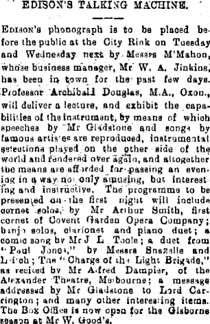 EDISOX'S TALKING MACHINE. Edison’s phonograph is to be placed before the public at the City Rink on Tuesday and Wednesday next by Messrs M’Mahon, whose business manager, Mr W. A. Jinkins, has been in town for the past few days. Professor Archibald Douglas, M.A., Oxon., will deliver a lecture, and exhibit the capabilities of the instrument, by means of which speeches by Mr Gladstone and songs by famous artistes are reproduced, instrumental aeteutions played on the other side of the world and rendered over again, and altogether the means are afforded for passing an evening in a way no only amusing, but interest ing and instructive. The programme to be presented on the first right wilt include cornet solos, by Mr Arthur Smith, first cornet of Govern Garden Opera Company; brnjr solos, clarionet and piano duet; a comic song bv Mr J L Toole ; a duet from ’■ Paul Jono<,” bv Messrs SnaXalle and Ld'oh ; Trie “ Charge of tin Light Brigade,” as recited by Mr Alfred Dampiar, of the Alexander Theatre, Melbourne; a message addressed by Mr Gladstone to Lord Carrington ; and many other interesting items. The Box Office is now open for the Gisborne season at Mr W. Good’s,