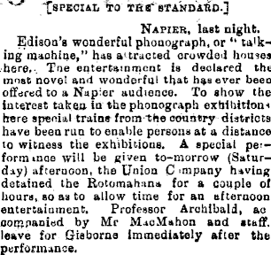 fseBCIAL TO THS STANDAItD.I Napier, last night. Edison’s wonderful phonograph, or “ talking machine,” has attracted crowded houses here. , Tne entertainment is declared the most novel and wonderful that has ever been offered to a Napier audience. To shoav the interest taken in the phonograph exhibitions here special trains from the country districts have been run to enable persons at a distance to witness the exhibitions. A special perform rnce will be given to-morrow (Saturday) afternoon, the Union C impany having detained the Rotomahana for a couple of hours, so as to allow time for an afternoon entertainment. Professor Archibald, an ootnpanied by Mr MacMahon and stuff, leave for Gisborne immediately after the performance.
