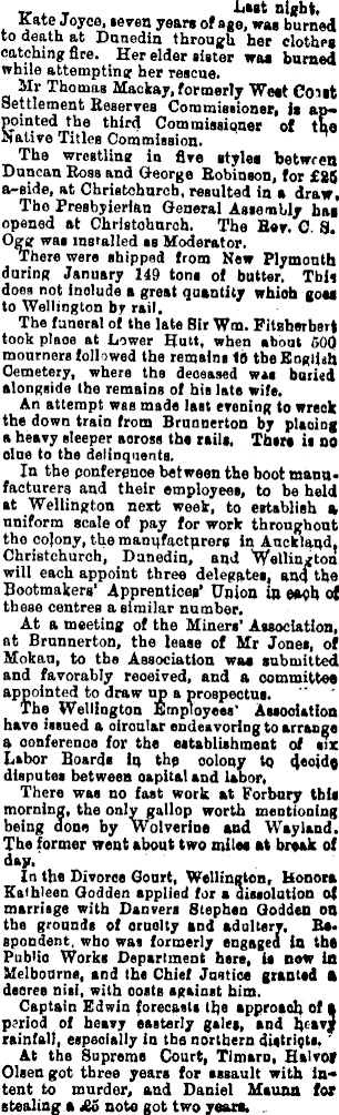 — . _ Lest night, Kate Joyce, seven years of age, was burned to death at Dunedin through her clothes catching fire. . Her elder sister was burned while attempting her rescue. Mr Thomae Mackay, formerly West Coist Settlement Reserves Commissioner, is appointed the third Commissioner of the Native Titles Commission. The wrestling in five styles betwren Duncan Roes and George Robinson, for £25 a-side, at Christchurch, resulted in a draw, Tho Preebyierian General Assembly has opened at Christchurch. The Rev. C. S. Ogg was installed as Moderator. There were shipped from New Plymouth during January 149 tons of butter. Tbh does not include a great quantity which goes to Wellington by rail. Tbe funeral of the late Bir Wm. Fitzherbert took place at Lower Hutt, when about 500 mourners followed the remains to tbe English Cemetery, where the deceased was buried alongside the remains of hie late wife. An attempt was made laet evening to wreck the down train from Brunnerton by placing a heavy sleeper serose the rails. There is no cine to the delinquents. In the conference between the boot manufacturers and their employees, to be held at Wellington next week, to establish a uniform scale of pay for work throughout tho cojony, the manufacturers in Auckland, Christchurch, Dunedin, and 'Wellington will each appoint three delegates, and the Bootmakers’ Apprentices’ Union in each of these centres a similar number. At a meeting of the Miners’ Association, at Brunnerton, the lease of Mr Jones, of Mokau, to tbe Association was submitted and favorably received, and a committee appointed to draw up a prospectus. The Wellington Employees' Association have issued a circular endeavoring to arrange a conference for the establishment of six Labor Boards in the colony to d ec foc disputes between capital and labor, There was no fast work at Forbury this morning, the only gallop worth mentioning being done by Wolverine and Wayland. The former went about two miles at break of day. In the Divorce Court, Wellington, Honora Kathleen Godden applied for a dissolution ot marriage with Danvers Stephan Godden on the grounds ot cruelty and adultery. Respondent, who was formerly engaged in ths Public Works Department here, is now in Melbourne, and the Chief Justice granted • decree nisi, with costs against him. Captain Edwin forecasts tfie approach of a period of heavy easterly gales, and heavy rainfall, especially in tbe northern districts. At the Supreme Court, Timaru, Hslvor Olsen got three years for assault with intent to murder, and Daniel Maunu for stealing a £5 note got two years.