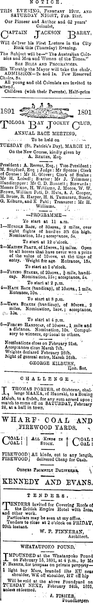 NOTICE, THIS EVENING, February 19th, and SATURDAY NIGHT, Feb. 21st. Our Pioneer and Author and 62 years’ Colonist, QAPTAIN JACKSON Will deliver his First Lecture in the City Rink thia (Thursday) Evening, The Subject will be—“ The Australian Colonies and Men and Women of the Times.” See Bills and Programmes. His Worship the Mayor will take the chair. ADMISSION—2s and Is, Few Reserved Chairs, All young and old Colonists are invited to attend. Children (with their Parents), Half-price 1891 1891 rpOLOGA JgAY JOCKEY ANNUAL RACE MEETING, To be held on TUESDAY (St. Patrick's Day), MARCH 17, On the New Course, kindly given by A. Reeves, Esq. President: A. Reeves, Esq.; Vice-President: M. Stopford, Esq ; Judge : Mr Spence; Clerk of Course : .Mr H. Glover; Clerk of Seales : Mr H. Loisel!; Starter: Mr J. Trimmer; Handicapper: Mr 0. D. Bennett; Stewards: Messrs Dixon, H. Williams, J. Moore, W. W. Brown, William Poti, D. Hata, A. J. Cooper, H. Bruce, R. Harper, H. B. Tamararu, Steele, G, Kilburn, and K Paki; Treasurer :Mr H. Williams, —PROGRAMME— To start at 11 a.m. 1— Hurdle Baoe, of 30sova,, 2 miles, over eight, flights of hurdiei 3ft 6in high. Nomination, 15s; accep’nnce, 53. To start at 12 o’clock. 2— Maiden Plate, of 15sovs„ 1J miles. Open to all horses that have never won a prize of the value of lOiovs. at the time of entry. Weight for age. Entrance, 15s. To start at 1 o’clock. 3— Flying Stakes, of 20sovs., J mile, handicap. Nomination, 15s; acceptance, ss, To start at 2 p.m. I—Hack Baoe (handicap), of lOjovs., 1 mile, Entrance, IDs. To start at 3 p.m. 5— Uawa Stakes (handicap), of BOsovs., 2 miles. Nomination, Isov. ; acceptance, . IdS, To start at 4 p.m. 6— Forced Handicap, of lOsovs., 1 mile and a distance. Nomination, 10s. Compulsory to winners, optional to others, Nominations close on February 21st, Acceptances doss March 7th, Weights declared February 28th. Night of general entry, March 16th. GEOBGE KILBURN. Hon. Sec, CHALLENGE. I THOMAS PORTER, ot Gisborne, chai- . lenge MAAKA, of Hauraki, to a Boxing Match, to a finish, for any sum agreed upon • match to come off on SATURDAY, February 28, at a hall in town. WHARF COAL AND FIREWOOD YARDS. COAL 1 I All Kinds in I /"I OAL I OAL 1 | Stock. | v, OAL ! FIREWOOD) All kinds, cut to any length, FIREWOOD) delivered Cheap for Cash. ObDEBS PROMPTLY Delivereb, KENNEDY AND EVANS. TENDERS. TENDERS invited for Covering Roofs of the British Empire Hotel with Iron, and other work, Particulars may be seen at my office. Tenders to close at 2 o’clock on FRIDAY, 20th instant. W. P. FINNERAN, Architect. WHATAUPOKO POUND, IMPOUNDED at the Whataupoko Pound on February 15, 1891, at 4 p.m., by Mr P. Barker, for trespass on private property—--1 light bay Mare, branded like KU near shoulder, WK off shoulder, HT off hip tbe above Poundyard on TtESDAY NEXT, February 24th, 1891, aniesß redeemed. J, FISHES, i’oundkeeperi