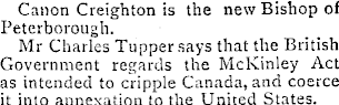 Canon Creighton is the new Bishop of Peterborough. Mr Charles Tupper says that the British Government regards the McKinley Act as intended to cripple Canada, and coerce it into annexation to the United States.