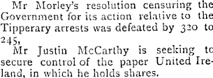 Mr Morley’s resolution censuring the Government for its action relative to the Tipperary arrests was defeated by 320 to 245 ’ Mr Justin McCarthy is seeking to secure control of the paper United Ireland, in which he holds shares.