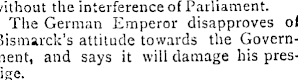 vithout the interference of Parliament. The German Emperor disapproves of Bismarck’s attitude towards the Government, and says it will damage his pres•'Se' . .