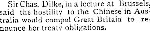 Sir Chas. Dilke, in a lecture at Brussels, said the hostility to the Chinese in Australia would compel Great Britain to renounce her treaty obligations.