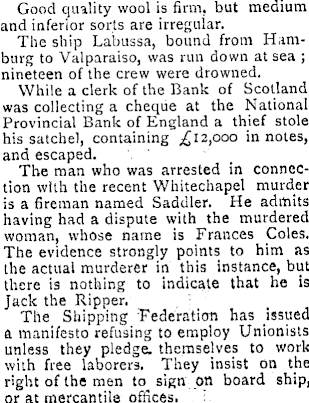 Good quality wool is firm, but medium and inferior sorts are irregular. The ship Labussa, bound from Hamburg to Valparaiso, was run down at sea ; nineteen of the crew were drowned. While a clerk of the Bank of Scotland was collecting a cheque at the National Provincial Bank of England a thief stole his satchel, containing in notes, and escaped. The man who was arrested in connection with the recent Whitechapel murder is a fireman named Saddler. He admits having had a dispute with the murdered woman, whose name is Frances Coles. The evidence strongly points to him as the actual murderer in this instance, but there is nothing to indicate that he is Jack the Ripper. The Shipping Federation has issued a manifesto refusing to employ Unionists unless they pledge, themselves to work with free laborers. They insist on the right of the men to sign on board ship, or at mercantile offices.