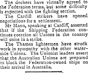 The dockers have virtually agreed to the Federation terms, but some difficulty is expected-with the fighting section. The Cardiff strikers have opened negotiations for a settlement. Mr Mann, speaking at Cardiff, asserted that if the Shipping Federation continues coercion al! Unions in the country will unite in a strike. The Thames lightermen have struck work in sympathy with the other waterside Unions. The Unionist leaders assert that the Australian Unions are prepared to block the Federation-owned ships on their arrival in Australia.