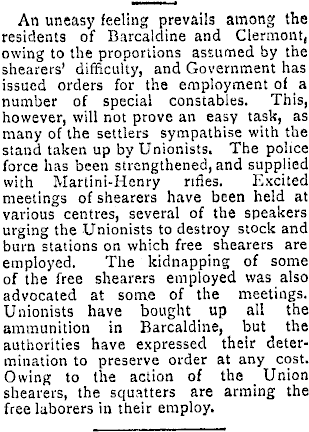 An uneasy feeling prevails among the residents of Barcaldine and Clermont, owing to the proportions assumed by the shearers’ difficulty, and Government has issued orders for the employment of a number of special constables. This, however, will not prove an easy task, as many of the settlers sympathise with the stand taken up by Unionists. The police force has been strengthened, and supplied with Martini-Henry rifles. Excited meetings of shearers have been held at various centres, several of the speakers urging the Unionists to destroy stock and bum stations on which free shearers are employed. The kidnapping of some of the free shearers employed was also advocated at some of the meetings. Unionists have bought up all the ammunition in Barcaldine, but the authorities have expressed their determination to preserve order at any cost. . Owing to the action of the _ Union shearers, the squatters are arming the free laborers in their employ.