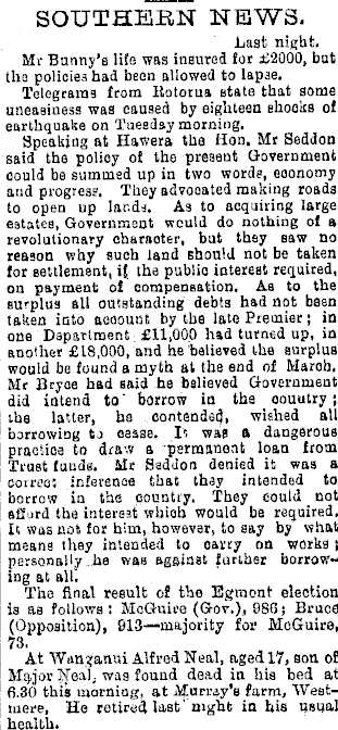 SOUTHERN NEWS. Last night. Mr Bunny’s lite was insured for £2OOO, but tho policies had been allowed to lapse. Telegrams from Rotorua state that some uneasiness was caused by eighteen ehoeks of earthquake on Tuesday morning. Speaking at Hawera the Hon. Mr Seddon said the policy of tho present Government could be summed up in two words, economy and progress. They advocated making roads to open up lands. As to acquiring large estates, Government would do nothing of a revolutionary character, but they saw no reason why such land should not be taken for settlement, if the public interest required, on payment of compensation. As to the surplus all outstanding debts had not been taken into account by the late Premier; in one Department £ll,OOO had turned up, in another £lB,OOO, and he believed the surplus would be found a myth at the end of March, Mr Bryce had said he believed Government did intend to borrow in the country ; the latter, he contended, wished all borrowing to oease. It was a dangerous practice to draw a permanent loan from Trust funds. Mr Sadiion denied it was a correct inference that they intended to borrow in the country. They could not afford the interest which would be required. It was not for him, however, to eay by what means they intended to carry on works ; personally he was against further borrowing al all'. The final result of the Egmont election is as follows: McGuire (Gov.), 986; Brace (Opposition), 913—majority for McGuire, 73. At Wanganui Alfred Neal, aged 17, son of Major Neal, was found dead in his bed at 6.30 this morning, at Murray's farm, Westmere, He retired last' night in his usual health.