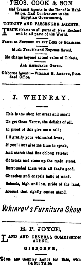 THOS. COOK & SON rial Transit Agents to the Dunedin Exhibition, Mail Contractors to the Egyptian Government), TOURIST AND PASSENGER AGENTS, ISSUE tickets to all parts of New Zealand and to all parts of the World. Passages Sxoubxd by ant Line or Stkamxbs. Much Trouble snd Expense Saved, No charge beyond actnal value of Tickets. All Amibtancb Gains. Gisborne Agent :—Wuliam E, Axnovn, Standard Office, J. WHINRAY. This is the shop for great and small To get Good Value, the delight of all. tn proof of this give me a call; 111 gratify yonr whimsiest freak. If you’ll but give me time to speak, Aad search that fine oblong retreat Of bricks and stone up the main street. SuHoundad there with aU that's good, Churches aad chapels built of wood. Schools, high and low. pride of the land, Around that sightly centre stand. Whmrav's Furniture Show E. P. JOYCE, Land and general commission AGENT, GIBB.OBNB, Uf Country Lands tor Sale, With Perfect Titles,