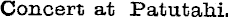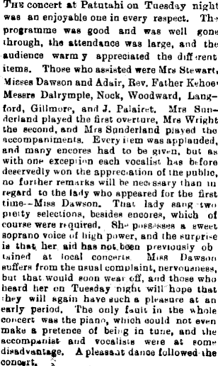 The concert at Patutahi on Tuesday night was an enjoyable one in every respect. Th j programme was good and was well gone through, the attendance was large, and the audience warm y appreciated the different items. Those who assisted were Mrs Stewart, Misses Dawson and Adair, Rev. Father Kehoe* Messrs Dalrymple, Nock, Woodward, Langford, Gillmore, and J. Palairet. Mrs Sunderland played the first overture, Mrs Wright the second, and Mrs Sunderland played the accompaniments. Every item was applauded, and many encores had to be giv<-u, but as with one exception each vocalist, has before deservedly won the apprec.ation of the public, no further remarks will bp necessary than m regard to the lady who appeared for tbe first time--Miss Dawson. That lady sang two pretty selections, besides encores, which of course were required, poss-sses a sweet soprano voice of high power, and the surprise is that her aid has not been previously ob tained at local concerts Miss Dawson suffers from tbe usual complaint, nervousness, but that would soon wear off, and those who beard her on Tuesday night will hope that ihey will again have such a pleasure at an early period. The only fault in the whole concert was the piano, which could not even make a pretence of beb-g in tune, and ihe accompanist and vocalists were at some disadvantage. A pleasaat dance followed the concert.