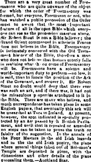 There arc a very great number of Freemasons who are quite unaware nf the object for which the order of* F r eema.-onry was formed, but everyone. Freemason or not, who has watched a public procession of tbe Order must be aware that th- most important feature of all h the open Bible which everyone can see as the procession marches along. Bir Robert Stout is not a Bible believer ; the Grand Orient commenced in atheistic France does not believe in the Bible. Freemasonry is intimately oonneo’ed with the Old Testament his’orv of the Bible, therefore a man who does not belt ve that history utterly fails in realising wha’ 'h on come of Freemasonry will be. Freemasons have a solemn and world-important duty to perform—no less, it is said, than to locate the position nf the Ark of the Covenant, and recover it. Sir Robert Stout no doubt would deny that there ever was such an ark, and if there was, it had not 'he miraculous p operties attributed to it |o ih? Bible, There are m iny who believe, and much correspondence has taken place in some English papers, that eventually this ark will be unearthed at Tara in Ireland, At present, however, tbe spot indicated is specially protected by an Ao' passed by h B-itiwh Parlia meat, and until that is repealed or amended no steps can be taken to prove the truth or falsity of the suggestion. In the annals of the Four Masters in the old Irish legends and iu the the old Irish poetry, the place where several 'hings taken out of Bninmon*s Temple are deposited is given, with *he dimensions and other details of the place concealing them.—Auckland Star,