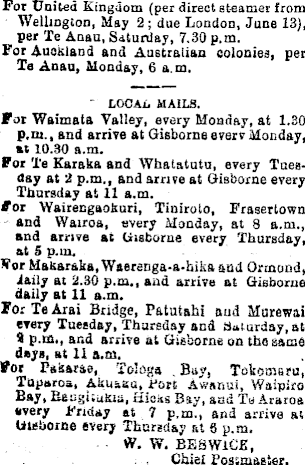 For United Kingdom (per direct steamer from Wellington, May 2; due London, June 13), per Te Anau, Saturday, 7.30 p.m. For Auckland and Australian colonies, per Te Anau, Monday, 6 a m. LOCAL MAILS. For Waimata Valley, every Monday, at 1.30 p.m., and arrive at GisborneevervMonday, at 10.30 a.m. For Te Karaka and Whatatutu, every Tuesday at 2 p.m., and arrive at Gisborne every Thursday at 11 a.m. For Wairengaokuri, Tinirolo, Frasertown and Wairoa, every Monday, at 8 a.m., and arnve at Gisborne every Thursday, at 5 p.m. Vor Makaraka, Waerenga-a-hika and Ormond, daily at 2.30 p.m., and arrive at Gisborne daily at 11 a.m. ForTeArai Bridge, Patutahi and Murewai every Tuesday, Thursday and Mat urday, at 2 p.m., and arrive at Gisborne on the same days, at 11 a.m. For Paterae, Tologa Buy, Tokomsru, Tuparca, Aauasu, Port Awanui, Waipiro Bay* Beugitukia, Hicks Bay, and Ta Araroa every Friday at 7 p.m., and arrive st Gisborne every Thursday st 6 p.m. W. W. BEBWICK, Chief Postmaster.
