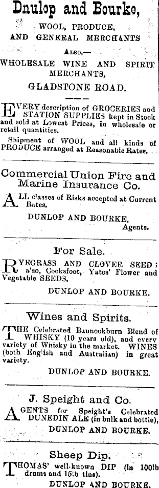 Dnulop and Bourke, ’ WOOL, PRODUCE, AND GENERAL MERCHANTS Also, — WHOLESALE WINE AND SPIRIT MERCHANTS, GLADSTONE ROAD. EVERY description of GROCERIES and STATION SUPPLIES kept in Stock and sold at Lowest Prices, ia wholesale or retail quantities. ronfe! ° f VVOOL and ali kinds of PRODUCE arranged at Reasonable Rates. Commercial Union Fire and Marine Insurance Co. ALL classes of Risks accepted at Current Bates. DUNLOP AND BOURKE, Agents. S'or Sale. Ryegrass and clover seed ; a’so, Cocksfoot, Yates’ Flower and Vegetable SEEDS. DUNLOP AND BOURKE. Wines and Spirits. rpHE Celebrated Bannockburn Blend of W HISKY (10 years old), and every variety of Whisky in the market. WINES (both English and Australian) in great variety. DUNLOP AND BOURKE. J. Speight and Co. AGENTS for Speight’s Celebrated DUNEDIN ALE (in bulk and bottle), DUNLOP AND BOURKE. Sheep Dip. fpHOMAS’ well-known DIP (in 1001 b JL drumsand 15’. b tins). DUNLOP AND BOURKE.
