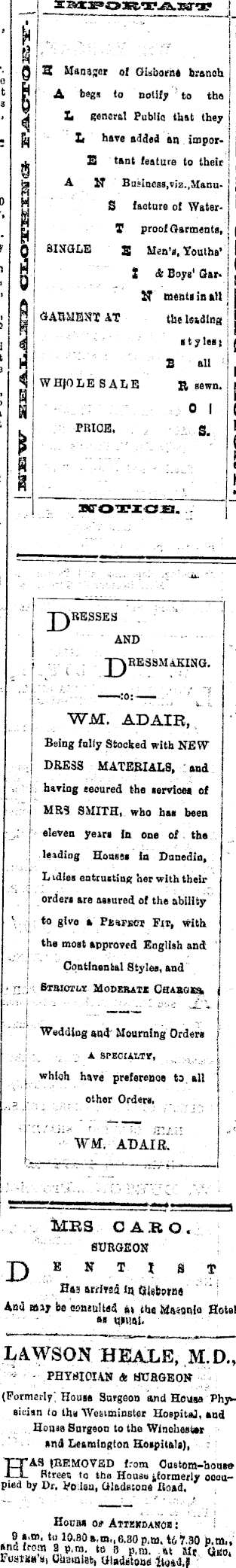 ■” ■ I !’■ ft 3 Manager of Gisborne branch j El “ A begs to notify to the I 53 9 I L general Public that they t have added an impor- I | tant feature to their : J A IT Business,viz.,Manu- .' £ 0 H S faeture of Water- j 5 ’■ T proof Garments, { J ft SINGLE 3 Men’s, Youths’ . i ” I A Boys’ Gar. j £ '• - ! S meats in #III h a| . GARMENT AT the leading * .1 styles; g e jj ® 6U h ii W H|O LESA Ij E R sewn a k ia« i I ‘ . PRICE. g h 8 H S SfOTICE. 1 £)RESSES AND PRESSMAKING. :o: — WM. ADAIR, Being fully Stocked with NEW ’ I DRESS MATERIALS, aud I having eecured the services of j MRS SMITH, who has been I eleven years in one of the leading Houses ia Dunedin, L idles entrusting her with their j orders are assured of the ability ■ to givo a Perfect Fit, with i l the most approved English and Continental Styles, and Stbiotuy Moderate Chargbs. j I Wedding and Mourning Orders j A SPECIALTY, which have preference tc all other Orders, WM. ADAIR. MRS CARO. SURGEON pENT I g T Hat arrived in And may be consulted at the MasaMo Hotel as usual. LAWSON BEALE, M.D., PHYSICIAN <fc SURGEON (Formerly! House Surgeon and Housa Physician lo ths Westminster Hospital, aud Housa Surgeon to the Winchester and Leamington Hospitals), HAS (REMOVED from Custom-house Rtreet to the House occupied by Dr. Bo Isu, Gladstone Road. Houm of Attekdanob : 9ajB ‘ tu 10-80 tt.m„6.30 p,m, 46 7.30 b.tn>, 1 and from 2 p.m. to 3 p.m. nt Mr (Jeu. I Foster h. Chemist, Gladstone 1104-I.'