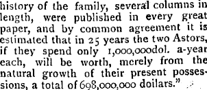 history of the family, several columns in length, were published in every great paper, and by common agreement it is estimated that in 25 years the two Astors, if they spend only i,000,000d01. a-year each, will be worth, merely from the natural growth of their present possessions, a total of 698,000,000 dollars.”