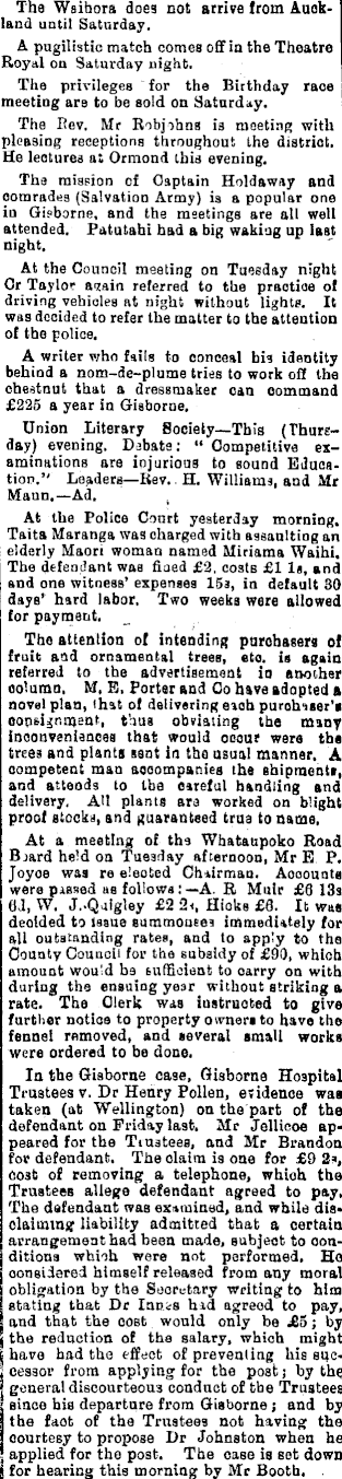 The Waihora does not arrive from Auckland until Saturday. A pugilistic match comes off in the Theatre Royal on Saturday night. The privileges for the Birthday race meeting ars to be sold on Saturday. The Rev. Mr Robjrhns is meeting with pleasing receptions throughout the district. He lectures at Ormond this evening. The mission of Captain Holdaway and comrades (Salvation Army) is a popular one in Gisborne, and the meetings are all well attended. Patutahi bad a big waking up last night. At the Council meeting on Tuesday night Cr Taylor aiain referred to the practice of driving vehicles at night without lights. It was decided to refer the matter to the attention of the police. A writer who fails to conceal his identity behind a nom-de-plume tries to work oft the chestnut that a dressmaker can command £225 a year in Gisborne. Union Literary Society—This (Thursday) evening. Debate; “ Competitive examinations are injurious to sound Education.” Leaders—Rev. H. Williams, and Mr Maun, —Ad. At the Police Court yesterday morning, Taita Maranga was charged with assaulting an elderly Maori woman named Miriama Waihi. Tbe defendant was fined £2. costs £1 Is, and and one witness’ expenses 15s, in default 30 days' hard labor. Two weeks were allowed tor payment. The attention of intending purchasers of fruit and ornamental trees, etc. is again referred to the advertisement io anaihsr column. M, E, Porter and Co have adopted a novel plan, that of delivering each purchaser's consignment, thus obviating the many inconveniences that would occur were the trees and plants sent in the usual manner. A competent man accompanies the shipments, and attends to the careful handling and delivery. AU plants are worked on blight proof stocks, and guaranteed trua to name. At a meeting of ths Whataupoko Road Bjard held on Tuesday afternoon, Mr E P. Joyoe was re elected Chairman. Accounts were passed as follows : —A. R Muir £6 13s 61, W. J..Quigley £2 2<, Hicks £6. It was decided to issue summouses immediately for all outstanding rates, and to apply to the County Council for the subsidy of £9O, which amount would be sufficient to carry on with during the ensuing year without striking a rate. The Clerk was instructed to give further notice to property owners to have the fennel removed, and several small works were ordered to bo done. In the Gisborne case, Gisborne Hospital Trustees v. Dr Henry Pollen, evidence waa taken (at Wellington) on the part of the defendant on Friday last. Mr Jellicoe appeared for the Trustees, and Mr Brandon for defendant. The claim is one for £9 2», cost of removing a telephone, which the Trustees allege defendant agreed to pay. The defendant was examined, and while disclaiming liability admitted that a certain arrangement had been made, subject to conditions whioh were not performed. He considered himself released from any moral obligation by the Secretary writing to him stating that Dr Innns hid agreed to pay, and that the cost would only be £5; by j the reduction of the salary, which might i have had the effect of preventing hie suej cessor from applying for the post; by the j general discourteous conduct of tbe Trustees ; since hie departure from Gisborne ; and by j the fact of the Trustees not having ths j courtesy to propose Dr Johnston when he applied for the post. The case is Bet down I for hearing this morning by Mr Booth.