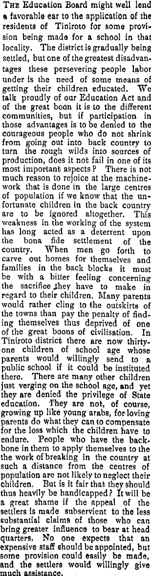The Education Board might well lend a favorable ear to the application of the residents of Tiniroto for some provision being made for a school in that locality. The district is gradually being settled, but one of the greatest disadvantages these persevering people labor under is the need of some means of getting their children educated. We talk proudly of our Education Act and of the great boon it is to the different communities, but if participation in those advantages is to be denied to the courageous people who do not shrink from going out into back country to turn the rough wilds into sources of production, does it not fail in one of its most important aspects ? There is not much reason to rejoice at the machinework that is done in the large centres of population if we know that the unfortunate children in the back country are to be ignored altogether. This weakness in the working of the system has long acted as a deterrent upon the bona fide settlement of the country. When men go forth to carve out homes for themselves and families in the back blocks it must be with a bitter feeling concerning the sacrifice they have to make in regard to their children. Many parents would rather cling to the outskirts of the towns than pay the penalty of finding themselves thus deprived of one of the great boons of civilisation. In Tiniroto district there are now thirtyone children of school age whose parents would willingly send to a public school if it could be instituted there. There are many other children just verging on the school age, and yet they are denied the privilege of State education. They are not, of course, growing up like young arabs, for loving parents do what they can to compensate for the loss which the children have to endure. People who have the backbone in them to apply themselves to the the work of breaking in the country at such a distance from the centres of population are not likely to neglect their children. But is it fair that they should thus heavily be handicapped? It will be a great shame if the appeal of the settlers is made subservient to the less substantial claims of those who can bring greater influence to bear at head quarters. No one expects that an expensive staff should be appointed, but some provision could easily be made, and the settlers would willingly give much assistance.