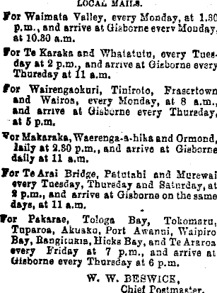 LOCAL MAILS. For Waimata Valley, every Monday, at 1.30 p.m., and arrive at Gisborne everv Monday, at 10.30 a.m. For Te Karaks and Whatatutu, every Tuesday at 2 p.m., and arrive at Gisborne every Thursday at 11 a.m. For Wairengaokuri, Tiniroto, Frasertown and Wairoa, every Monday, at 8 a.m., and arrive at Gisborne every Thursday, at 5 p.m. For Makaraka, Waerenga-a-hika and Ormond, laily at 2.30 p.m., and arrive at Gisborne daily at 11 a.m. For Te Arai Bridge, Petatshi and Murewai every Tuesday, Thursday and Saturday, at 2 p.m., and arrive at Gisborne on the same days, at 11 a.m. For Pakarae, Tologa Bay, Tokomaru, Tuparoa, Akuaso, Port Awanui, Waipiro Bay, Bangiiiiina, Hicks Bay, and Te Araroa every Friday at 7 p.m., and arrive at Gisborne every Thursday at 6 p.m. W. W. BE SWICK, Chief Postmaster.
