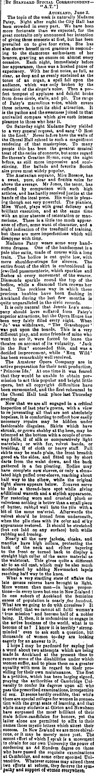 |By Standard Special Correspondent—“A.T.”] Auckland, June 2. The topic of the week is naturally Madame Patey. Night after night the City Hall has been crowded in every part. We have been more fortunate than we expected, for the great contralto only announced her intention of giving three concerts at first, but has been prevailed on to give four extra. She has also shown herself most gracious in responding to the clamorous enthusiasm of her hearers, granting an encore on almost every occasion. Each night, immediately before her appearance, theie was a hushed pause of expectancy. With her first notes, as full, as clear, as deep and as evenly sustained as the tones of an organ, a spell fell upon the audience, which was only broken by the cessation of the singer’s voice. Then a perfect tempest of applause and. delight broke from dress circle, stalls, and pit. The range of Patey's marvellous voice, which covers three octaves, is not its chief attraction. It is the pathos and the sweetness joined to that unrivalled compass which give such intense pleasure to thos'e who hear it. On Saturday night Madame Patey yielded to a very general request, and sang * 0 Best in the Lord.’ Never before have the walls of the Choral Hall echoed to such a magnificent rendering of that masterpiece. To many people this has been the greatest musical treat of the series ot concerts, but soma regard Berthoven's Creation Hymn, sung the night before, as still more impressive and soulstirring. Her ballads and favorite Scotch airs prove most widely popular. The Australian eopra'no, Miss Bossow, has a sweet, pure, clear and flexible voice far above the average. Mr Jones, the tenor, has suffered by comparison with such high artistes, and has hardly received justice at the hands of the local press. His voice is pleasing though not very powerful. The pianiste, Miss Wood, plays with great delicacy and brilliant execution, and at the same time with an utter absence of ostentation or mannerisms. There is a little too much appearance of effort, some want ot character, and a slight indication of the treadmill of training, but these are mere imperfections which will disappear with time. Madame Patey wears some very handsome dresses. One of the handsomest is a pale blue satin, made of course with a long train. Ths bodice is cut quite low, with mere shoulder-straps for sleeves. The entire front of the skirt is embroidered in jewelled passementerie, which sparkles and flashes at every movement of the wearer. Diamonds sparkle round the top of the bodice, while a diamond tiara crowns her head. The reckless way in which these precious baubles have been flashing in Auckland during the last few months is quite unparalleled in the civic records. It is only natural that Jennie Leg's company should have sugared from Patey's superior attractions, but the Opera House has been very fairly filled every right. When •Jo ’ was withdrawn, 11 The Grasshopper ’ was put upon the boards. This is a very different play, and some friends of mine who went to see it, were forced to leave the theatre on account of its vulgarity. ‘ Jack in the Box' succeeded this, and was a decided improvement, while ' Bun Wild ’ has been remarkably well received. The Amateur Opera Company are in active preparation for their next production, ‘ Princess Ida.’ At one time it was feared that they would he unable to obtain permission to act this popular and bright little opera, but all copyright difficulties have been surmounted, and the first rehearsal in the Choral Hall took place last Thursday evening. Now that we are all engaged in a critical inspection of last year’s gowns, with a view to re juvenating all that are not absolutely hopeless, it is comforting to reflect how easily necessary repairs may be hidden under fashionable disguises. Skirts which have shrunk, or grown shabby at th? hem, may be trimmed at the bottom with a couple of crossway frills, if of silk or comparatively light materials; or with fur, velvet bands, or braiding, if of cloth or heavy stuff. Full skirts may be made plain, the front breadth gored ata the sides, and fitted up by short darts from the waist down, and the back gathered in a fan pleating. Bodies may have complete new sleeves, or only a simulated high puffed over-sleeve, reaching about half way to the elbow, while the original tight sleeve appears below. Zouaves serve to hide a thread-bare spot while giving additional warmth and a stylish appearance. For restoring worn and crushed plush or velveteen nothing is better than a small piece of butter, rubbed well into the pile with a bit of the same ma’erial. Afterwards the velvet shou'd be ironed from underneath, when the pile rises with its color and Bi’ky appearance restored. It should be stretched (but not laid on any surface) both while rubbing and ironing. Nearly all the new jackets, cloaks, and mantles have high collars, protecting the back of the neck and either tapering to the front or turned back to display a straight high collar of the same material as the waistcoat. This gives quite a different air to an old coat, which may be also much modernised by adding Newmarket lapels reaching half way to the knee, What a very startling state of affairs the late census returns have brought to light. More women than men—in large proportions—in every town but one in New Zealand 1 In one suburb of Auckland the feminine excess of population is nearly five hundred. What are we going to do with curselves ? It is evident that we cannot all fulfil woman’s ■ true mission ’ and become half of a nobler being. If, then, it is unfeminine to engage in the active business of the world, what is to become of us ? I know it is terribly * strongminded’ even to ask such a question, but thousands of women to-day are looking eagerly for an answer to it, I hope I may be pardoned for saying just a word about two attempts which are being made in Auckland at the present time to remo