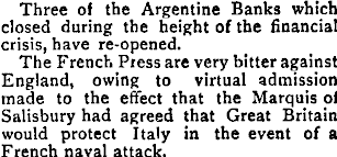 Three of the Argentine Banks which closed during the height of the financial crisis, have re-opened. The French Press are very bitter against England, owing to virtual admission made to the effect that the Marquis of Salisbury had agreed that Great Britain would protect Italy in the event of a French naval attack.