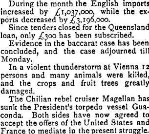 During the month the English imports increased by £1,037,000, while the exports decreased by £3,196,000. Since tenders closed for the Queensland loan, only £3OO has been subscribed. Evidence in the baccarat case has been concluded, and the case adjourned till Monday. In a violent thunderstorm at Vienna 12 persons and many animals were killed, and the crops and fruit trees greatly damaged. The Chilian rebel cruiser Magellan has sunk the President’s torpedo vessel Guaconda. Both sides have now agreed to accept the offers of the United States and France to mediate in the present struggle.
