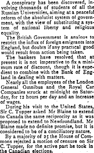 A conspiracy has been discovered, involving thousands of students of all the Russian Universities, aiming ata peaceful reform of the absolutist system of government, with the view of substituting a system of national liberty and religious equality. The British Government is anxious to restrict the influx of foreign emigrants into England, but doubts if any practical good would result from action being taken. The bankers have resolved that at present it is not imperative to fix a minimum rate of discount, though it is expedient to combine with the Bank of England in dealing with matters. Nearly all the employees of the London General Omnibus and the Royal Car Companies struck at midnight on Saturday, for 12 hours per day and an increase of wages. During his visit to the United States, Sir C. Tupper asked Mr Blaine to extend to Canada the same reciprocity as it was proposed to extend to Newfoundland. Mr Blaine made no definite promise, but it is considered to bo of a conciliatory nature, By a majority of 25 the House of Commons rejected a motion of censure on Sir C. Tupper, for the active part he took in the Canadian elections,