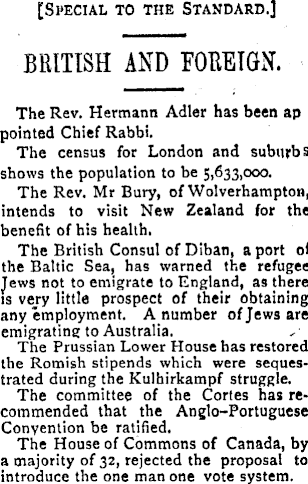 [Special to the Standard.] BRITISH AND FOREIGN. The Rev. Hermann Adler has been ap pointed Chief Rabbi. The census for London and suburbs shows the population to be 5,633,000. The Rev. Mr Bury, of Wolverhampton, intends to visit New Zealand for the benefit of his health. The British Consul of Diban, a port of the Baltic Sea, has warned the refugee jews not to emigrate to England, as there is very little prospect of their obtaining any employment. A number of Jews are emigrating to Australia. The Prussian Lower House has restored the Romish stipends which were sequestrated during the Kulhirkampf struggle. The committee of the Cortes has recommended that the Anglo-Portuguese Convention be ratified. The House of Commons of Canada, by a majority of 32, rejected the proposal to introduce the one man one vote system.