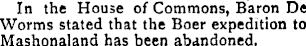 In the House of Commons, Baron De Worms stated that the Boer expedition to Mashonaland has been abandoned.