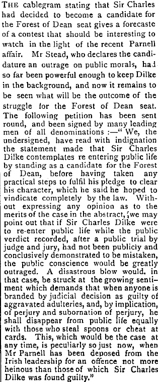 The cablegram stating that Sir Charles had decided to become a candidate for the Forest of Dean seat gives a forecaste of a contest that should be interesting to watch in the light of the recent Parnell affair. Mr Stead, who declares the candidature an outrage on public morals, had so far been powerful enough to keep Dilke in the background, and now it remains to be seen what will be the outcome of the struggle for the Forest of Dean seat. The following petition has been sent round, and been signed by many leading men of all denominations : —“ We, the undersigned, have read with indignation the statement made that Sir Charles Dilke contemplates re entering public life by standing as a candidate for the Forest of Dean, before having taken any practical steps to fulfil his pledge to clear his character, which he said he hoped to vindicate completely by the law. Without expressing any opinion as to the merits of the case in the abstract, [we may point out that if Sir Charles Dilke were to re-enter public life while the public verdict recorded, after a public trial by judge and jury, had not been publicly and conclusively demonstrated to be mistaken, the public conscience would be greatly outraged. A disastrous blow would, in that case, be struck at the growing sentiment which demands that when anyone is branded by judicial decision as guilty of aggravated adulteries, and, by implication, of perjury and subornation of perjury, he shall disappear from public life equally with those who steal spoons or cheat at cards. This, which would be the case at any time, is peculiarly so just now, when Mr Parnell has been deposed from the Irish leadership for an offence not more heinous than those of which Sir Charles Dilke was found guilty.”