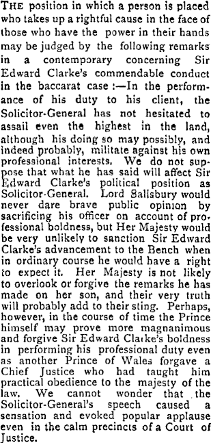 The position in which a person is placed who takes up a rightful cause in the face of those who have the power in their hands may be judged by the following remarks in a contemporary concerning Sir Edward Clarke’s commendable conduct in the baccarat case :—ln the performance of his duty to his client, the Solicitor-General has not hesitated to assail even the highest in the land, although his doing so may possibly, and indeed probably, militate against his own professional interests, We do not suppose that what he has said will affect Sir Edward Clarke's political position as Solicitor-General. Lord Salisbury would never dare brave public opinion by sacrificing his officer on account of pro. fessional boldness, but Her Majesty would be very unlikely to sanction Sir Edward Clarke’s advancement to the Bench when in ordinary course he would have a right to expect it. Her Majesty is not likely to overlook or forgive the remarks he has made on her son, and their very truth will probably add to their sting. Perhaps, however, in the course of time the Prince himself may prove more magnanimous and forgive Sir Edward Clacke’s boldness in performing his professional duty even as another Prince of Wales forgave a Chief Justice who had taught him practical obedience to the majesty of the law. We cannot wonder’ that . the Solicitor-General’s speech caused a sensation and evoked popular applause even in the calm precincts of a Court of Justice.