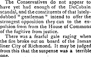 The Conservatives do not appear to have yet had enough of the DeCobain scandal, and the constituents of that latelydubbed “ gentleman ” intend to offer the strongest opposition they can to the expulsion from from the House of Commons of the fugitive from justice. There was a fearful gale raging when the fire broke out on board of the Inman liner City of Richmond. It may be judged from this that the suspense was a terrible one.