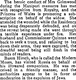 The heroic conduct of Mrs Grimwood during the Manipuri massacre has met with recognition from Royalty, and the Princess of Wales is promoting a subscription on behalf of the widow. She attended the wounded while the Residency was being desperately defended, and on the retreat being made she went through a terrible experience under fire. Her husband and Commissioner Quinton went back to seek a truce, and refusing to lay down their arms, they were captured, the dreadful sequel being still fresh in the minds of readers. Baron Hirsch, who is called the Modern Moses, has visited Russia on behalf of his illtreated compatriots. He was received in a friendly manner, and the authorities appear to be in favor of moderation in the expulsion of Jews.
