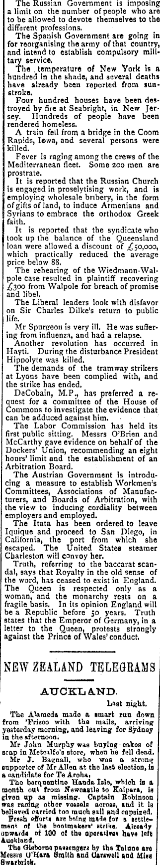 The Russian Government is imposing [ a limit on the number of people who are I to be allowed to devote themselves to the ' different professions. 1 The Spanish Government are going in , for reorganising the army of that country, , and intend to establish compulsory milli tary service. r The . temperature of New York is a - hundred in the shade, and several deaths 1 have already been reported from sun--1 stroke. Four hundred houses have been des--1 troyed by fire at Seabright, in New Jer--1 sey. Hundreds of people have been rendered homeless. : A train fell from a bridge in the Coom Rapids, lewa, and several persons were ‘ killed. ; Fever is raging among the crews of the I Mediterranean fleet. Some 200 men are 1 prostrate. - It is reported that the Russian Church ’ is engaged in proselytising work, and is employing wholesale bribery, in the form of gifts of land, to induce Armenians and Syrians to embrace the orthodox Greek faith. It is reported that the syndicate who took up the balance of the Queensland loan were allowed a discount of £50,000, which practically reduced the average price below 88. The rehearing of the Wiedmann-Wal-pole case resulted in plaintiff recovering £3OO from Walpole for breach of promise and libel. The Liberal leaders look with disfavor on Sir Charles Dilke’s return to public life. Mr Spurgeon is very ill. He was suffering from influenza, and had a relapse. Another revolution has occurred in Hayti. During the disturbance President Hipnolyte was killed. The demands of the tramway strikers at Lyons have been complied with, and the strike has ended. DeCobain, M.P., has preferred a request for a committee of the House of Commons to investigate the evidence that can be adduced against him. The Labor Commission has held its first public sitting. Messrs O’Brien and McCarthy gave evidence on behalf of the Dockers’ Union, recommending an eight hours’ limit and the establishment of an Arbitration Board. The Austrian Government is introducing a measure to establish Workmen's Committees, Associations of Manufacturers, and Boards of Arbitration, with the view to inducing cordiality between employers and employed. The Itata has been ordered to leave Iquique and proceed to San Diego, in California, the port from which she escaped. The United States steamer Charleston will convoy her. Truth, referring to the baccarat scandal, says that Royalty in the old sense of the word, has ceased to exist in England. The Queen is respected only as a woman, and the monarchy rests on a fragile basis. In its opinion England will be a Republic before 50 years. Truth states that the Emperor of Germany, in a letter to the Queen, protests strongly against the Prince of Wales’conduct. NEW ZEALAND TELEGRAMS AUCKLAND. Last night. The Alameda made a smart run down from 'Frisco with the mails, arriving yesterday morning, and leaving for Sydney in the afternoon. Mr John Murphy was buying cakes of scap in Metcalfe’s store, when he fell dead. Mr J. Bagnall, who was a strong supporter of Mr Allen at the last election, is a candidate for Te Aroha. The barquentine Handa Isle, which is a month out from Newcastle to Kaipara, is given up as missing. Captain Robinson was racing other vessels across, and it is believed carried too much sail and capsized, ( Fresh efforts are being made for a nettle—man', nt the hootmakera’ strike, Already , onwards of 100 of ths operatives have left , Auckland. , Ths Gisborne passengers by ths Talnne are 1 Messrs O’Hara Smith and Carswell and Miss , Bwarbrlok, ,