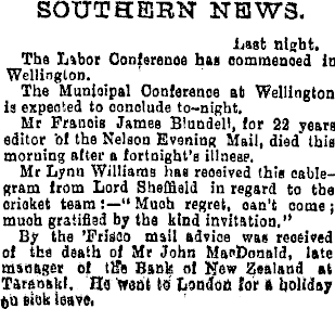 SOUTHERN NEWS. Last night. The Labor Conference has commenced in Wellington. The Municipal Conference at Wellington is expected to conclude to-night. Mr Francis James Blundell, for 22 years editor bf the Nelson Evening Mail, died this I morning after a fortnight's illness. Mr Lynn Williams has received this eable- | gram from Lord Sheffield in regard to the cricket team “ Much regret, can’t come ; much gratified by the kind invitation.’’ By ths ’Frisco mail advice was received of the death of Mr John MacDonald, late manager of Ufa Bank of New Zealand at Taranaki. He want td London for a holiday on sick leave,