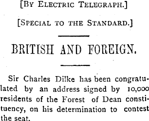 [By Electric Telegraph.] [Special to the Standard.] BRITISH AND FOREIGN. Sir Charles Dilke has been congratulated by an address signed by 10,000 residents of the Forest of Dean constituency, on his determination to contest the seat.