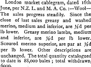 London market cablegram, dated 16th June, per N.Z. L. and M. A. Co. :—Wool — The sales progress steadily. Since the close of last sales greasy and washed merino, medium and inferior, are %d per lb lower. Greasy merino lambs, medium and inferior, are Jsd per lb lower. Scoured merino superior, are par at '/2A per lb lower. Other descriptions are unchanged. The total quantity catalogued to date is 88,000 bales ; total withdrawn, 6000.