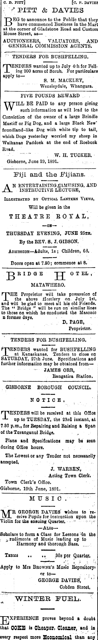 C. D. PITT] [O. P. DAVIES PITT & DAVIES BEG to announce to the Public that they have commenced Business in the Mart at the corner of Gladstone Road and Custom House Street, as— AUCTIONEERS, VALUATORS, AND GENERAL COMMISSION AGENTS. TENDERS FOR BUSHFELLING. TENDERS wanted up to July 4th for Felling 200 acres of Scrub. For particulars apply to— S. M. MACKLEY, Wensleydale, Whangara. FIVE POUNDS REWARD WILL BE PAID to any person giving such information as will lead to the Conviction of the owner of a large Brindle Mastiff or Pig Dog, and a large Black New’ foundland-like Dog with white tip to tail, which Dogs yesterday worried my sheep in Waikanae Paddock at the end of Roebuck Road. W. H. TUCKEB. Gisborne, June 19, 1891. Fiji and the Fijians. AN ENTERTAINING,JJAMUSING, AND INSTRUCTIVE LECTURE, Illustrated by Optical Lantern Views, Will be given in the THEATRE ROYAL, —ON—THURSDAY EVENING, JUNE 25th. By the REV. S. J. GIBSON. Admission—Adults, Is ; Children, 6d. Doors open at 7.30; commence at 8. Jg RID G E ~p|~ OTEL , MATAWHERO. THE Proprietor will take possession of the above Hoatlery on July Ist, and will be glad to meet all his old Friends. The “ Bridge ” will be run on similar lines to those on which he conducted the Masonic n former days. D. PAGE, Proprietor. TENDERS FOR BUSHFELLING, Tenders wanted - for bushfelling at Kanaekanae. Tenders to close on SATURDAY, 27th June. Specifications and further information may be obtained from— JAMES ORB, Bangatira Station. GISBORNE BOROUGH COUNCIL. NOTICE. riYENDEES will be received at this Office -*-■ up to TUESDAY, the 23rd instant, at 7 30 p.m„ for Repairing and Raising a Span of the Turanganul Bridge, Plans and Specifications may be seen during Office hours. The Lowest or any Tender not necessarily accepted, J. WARREN, Acting Town Clerk, Town Clerk’s Office. Gisborne, 19th June, 1891. MUSIC. MR GEORGE DAVIES wishes to receive Pupils for instruction upon the Violin for the ensuing Quarter, —Also— Scholars to form a Class for Lessons -in the rudiments of Music leading up to Harmony and thorough Bass. Tubus .. ~ 30s per Quarter. Apply to Mrs Browne's Music Repository! or to— GEORGE DAVIES, Cobden Street. WINTER FUEL. proves beyond a doubt that COKE is Cheaper, Cleaner, and in every respect more Economical than any