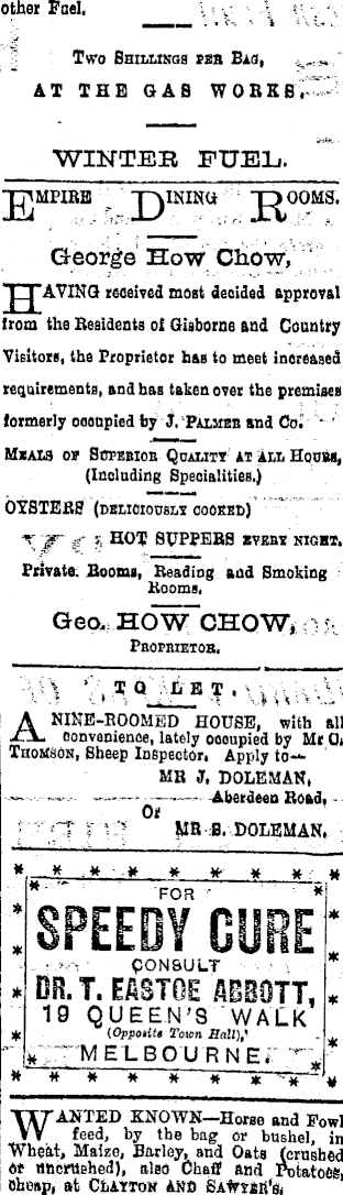 other Fuel. Two Shillings per Baa, AT THE GAB WORKS. WINTER FUEL. ■gIMPIRE JOINING George How Chow, ~|I2|~AVING received most decided approval from the Residents of Gisborne and Country Visitors, the Proprietor has to meet increased requirements, and has taken over the premises formerly occupied by J. Palmes and Co. Meals of Sopebiob Quality at all Houbs, (Including Specialities.) OYSTERS (deliciously cooked) HOT SUPPERS EVERY NIGHT. Private. Booms, Reading and Smoking Booms. Geo. HOW” CHOW, Proprietor. TO LET. A NINE-ROOMED HOUSE, with all convenience, lately occupied by Mr 0. Thomson, Sheep Inspector, Apply to— MB J, DOLEMAN, Aberdeen Bead, Or MR 0. DOLEMAN. * ******* ft * " FOR * : SPEEDY CURE: CONSULT * * DR. T. EfiSTOE ABBOTT, * 19 QUEEN’S WALK * {OpposUt Town Hall),' * * MELBOURN E. / * * * * * * < ft ’ * WANTED KNOWN—Horse and Fowl feed, by the bag or bushel, in Wheat, Maize, Barley, and Oats (crushed or uncrtiehed), also Chaff and Potatoes, Cheap, at Clayton ANO Sawyer’s,