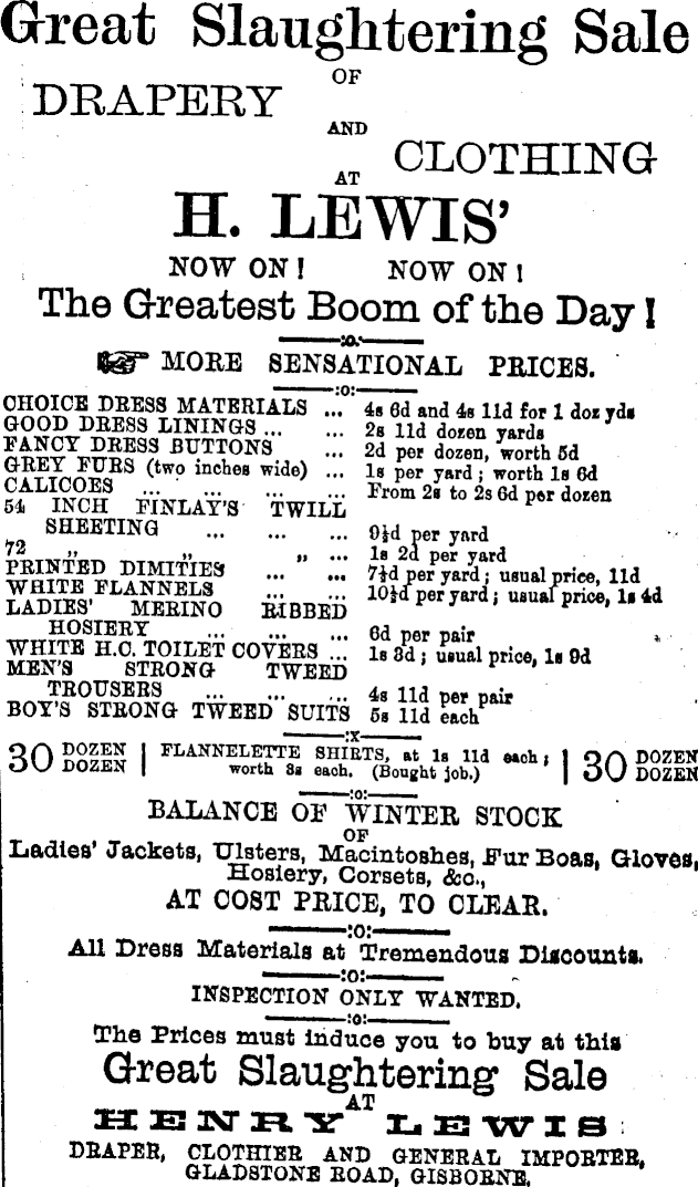 Great Slaughtering Sale OF DRAPERY AND AT CLOTHING H. LEWIS’ NOW ON I NOW ON I The Greatest Boom of the Day I —.l X)/'—'" 6®“ MORE SENSATIONAL PRICES. nnnn tibSt 4s 6d 4s lld or 1 GOOD DRESS LININGS 2s lid dozen vards B n T TON3 ... 2d per do°ze“ 5d ( two inches Wlde ) ••• 18 P er y ard ; worth Is fid -A'At From 2s to 2s 6d per dozen 54 INCH FINLAY’S TWILL H SHEETING 914 y er y ar j PrSKSh’ - " w P»7X d ».uJpri~. 1U BIBBED HOSIERY 6d ner nfl :, WHITE H.O. TOILET COVERS ... is 3d; usual price. Is 9d MEN’S STRONG TWEED P ’ TROUSERS ... ... 4s lid per pair BOY’S STRONG TWEED SUITS 5s lid each —■ ■ ;x- —— 30 DO7KN I FLANNEL ®TTE shirts, at la lid each; 1 DOZEN DOZEN | worth 3a each. (Bought job.) | O\J DOZEN BALANCE OF WINTER STOCK OF Ladies’ Jackets, Ulsters, Macintoshes, B’ur Boas, Gloves, Hosiery, Corsets, &c., AT COST PRICE, TO CLEAR. :o—- : Dress Materials at Tremendous Di aeon n fa. :<>:■■ i INSPECTION ONLY WANTED. — ■ :q»—, The Prices must induce you to buy at this Great Slaughtering Sale xa: es ikt n y at x, ew i s DRAPER, CLOTHIER AND GENERAL IMPORTER. GLADSTONE ROAD, GISBORNE.