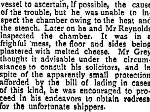 vessel to ascertain, If possible, the cause of the trouble, but he was unable to inspect the chamber owing to the heat and the stench. Later on he and Mr Reynolds inspected the chamber. It was in a frighful mess, the floor and sides being plastered with melted cheese. Mr Grey thought it advisable under the circumstances to consult his solicitors, and In spite of the apparently small protection afforded by the bill of lading in cases of this kind, he was encouraged to proceed in his endeavors to obtain redress for the unfortunate shippers.