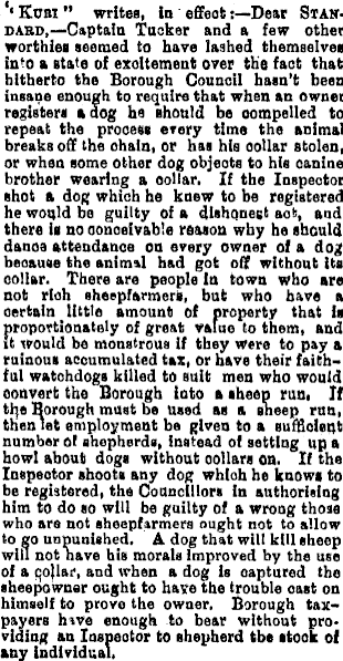 1 Kubi ” writes, in effect Dear Standard,—Captain Tucker and a few other worthies seemed to have lashed themselves into a state of exoitement over the fact that hitherto the Borough Council hasn’t been insane enough to require that when an owner registers a dog he should be compelled to repeat the process every time the animal breaks off the chain, or has his collar stolen, or when some other dog objects to his canine brother wearing a collar. If the Inspector shot a dog which he knew to be registered he would be guilty of a dishonest act, and there is no conceivable reason why he should danoa attendance on every owner of a dog because the animal had got off without its collar. There are people In town who are not rich aheeplarmers, but who have a certain little amount of property that Is proportionately of great value to them, and it would be monstrous if they were to pay a ruinous accumulated tax, or have their faithful watchdogs killed to suit men who would convert the Borough into a sheep run. If the Borough must be used as a sheep run, then let employment be given to a sufficient number of shepherds, instead of setting up a howl about dogs without collars on. If the Inspector shoots any dog which he knowi to be registered, the Councillors in authorising him to do so will be guilty of a wrong those who are not aheepfarmers ought not to allow to go unpunished. A dog that will kill sheep will not have his morals improved by the use of a collar, and when a dog is captured the sheepowner ought to have the trouble cast on himself to prove the owner. Borough taxpayers hive enough to bear without providing an Inspector to shepherd tbe stock of any individual,