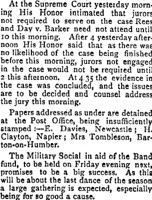 At the Supreme Court yesterday morning His Honor intimated that jurors not required to serve on the case Rees and Day v. Barker need not attend until io this morning. After 4 yesterday afternoon His Honor said that as there was no likelihood of the case being finished before this morning, jurors not engaged in the case would not be required until 2 this afternoon. At 435 the evidence in the case was concluded, and the issues are to be decided and counsel address the jury this morning. Papers addressed as under are detained at the Post Office, being insufficiently stamped E. Davies, Newcastle; H. Clayton, Napier; Mrs Tombleson, Bar-ton«on-Humber. The Military Social in aid of the Band fund, to be held on Friday evening next, promises to be a big success. As this will be about the last dance of the season a large gathering is expected, especially being for so good a cause.