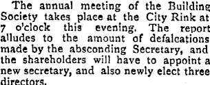 The annual meeting of the Building Society takes place at the City Rink at 7 o’clock this evening. The report alludes to the amount of defalcations made by the absconding Secretary, and the shareholders will have to appoint a new secretary, and also newly elect three directors.