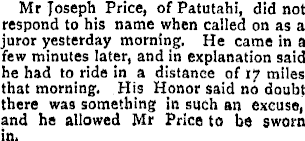 Mr Joseph Price, of Patutahi, did not respond to his name when called on as a juror yesterday morning. He came in a few minutes later, and in explanation said he had to ride in a distance of 17 miles that morning. His Honor said no doubt there was something in such an excuse, and he allowed Mr Price to be sworn in.