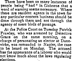 There have been so many instances st people being, “ had ” in Gisborne that a word of -warning seems necessary. Where there are resident agents in the town for any particular concern business should be done through them and not through the agency of mere birds of passage. At the Police Court on Tuesday Patrick Frawjey, who was arrested by Detective Grace on the same morning, on a charge of personating an elector at Danevirke, was remanded to Napier, the case to be heard on Monday. The accused has the appearance of a laborer v/ho would not know much about the laws regulating elections.