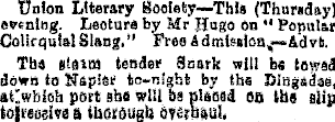 Union Literary Society—This (Thursday) evening. Lecture by Mr Hugo on “ Popular Colkquial Slang. ” Free A drnl'-sioa .—Ad vt. The ateinj tender Snark will bs towed down to Napier to-night by the Dings das, at'whlch port she will ba placed on tha slip to jreoelve a thorougli dverßAul.